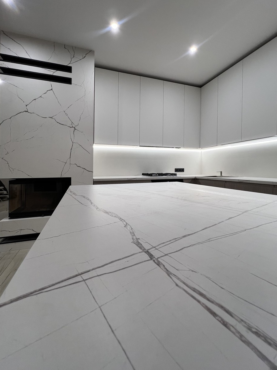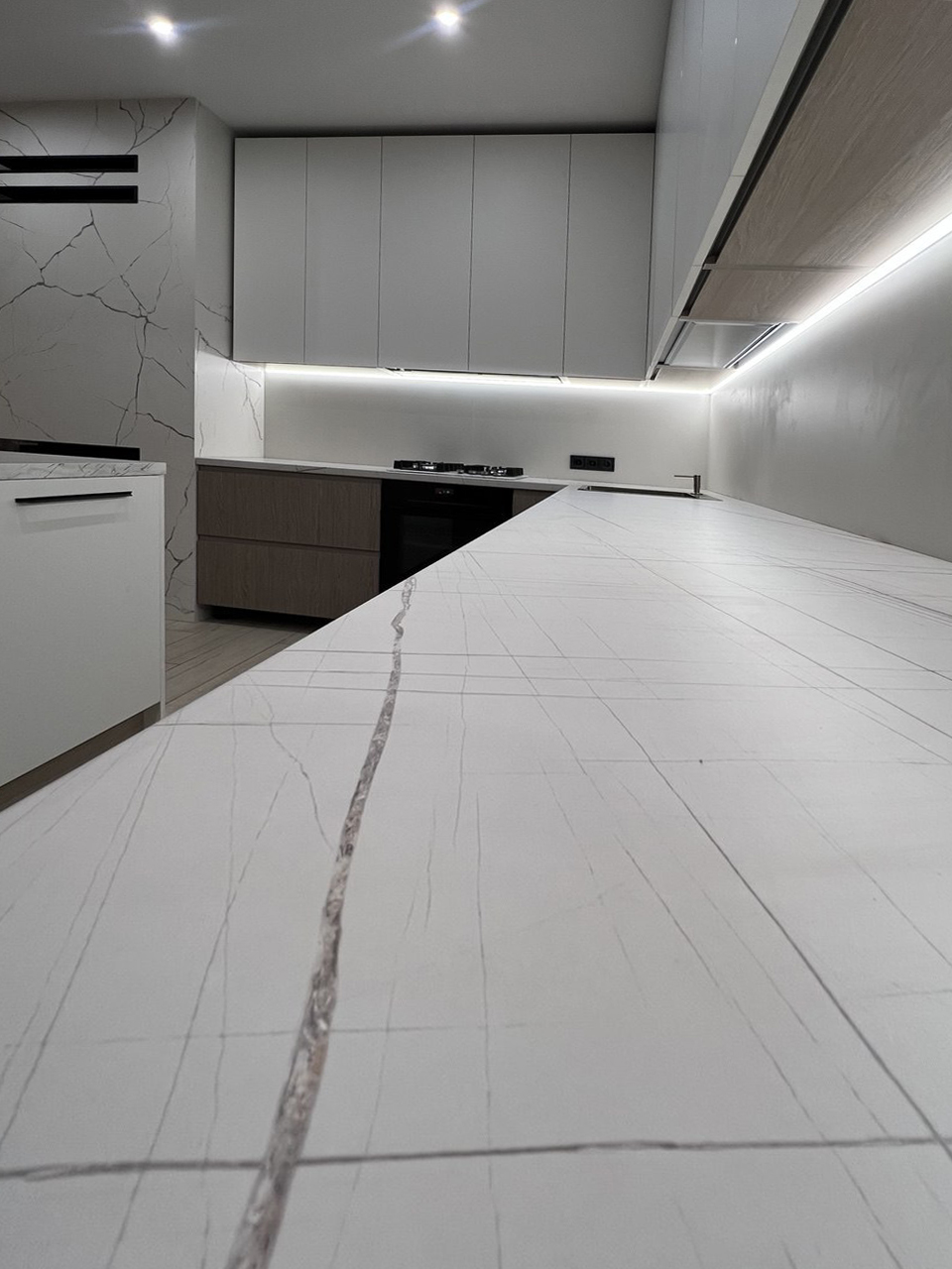 Body – Urban Oyster oak. Countertop – Asturias marble. Island – Asturias marble with PVC edge.