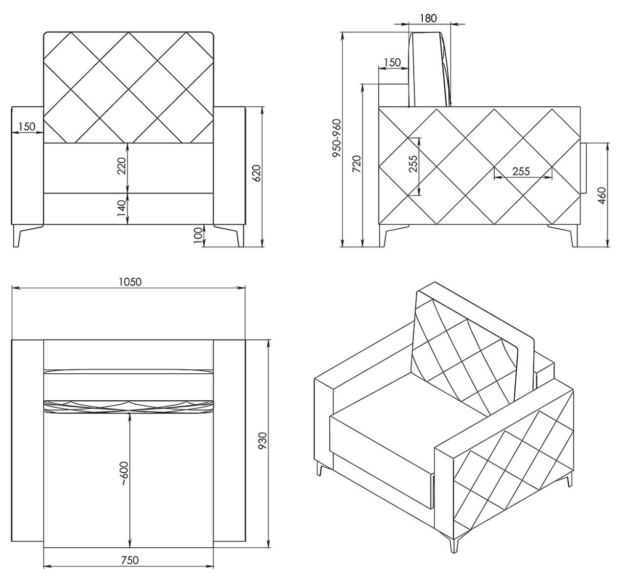 Armchair: 1050 (w) х 930 (d) х 960 (h).