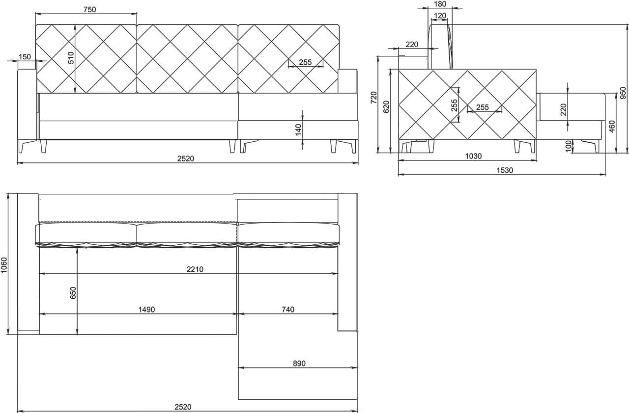 Corner sofa: 2520 (w) х 1530 (d) х 960 (h).