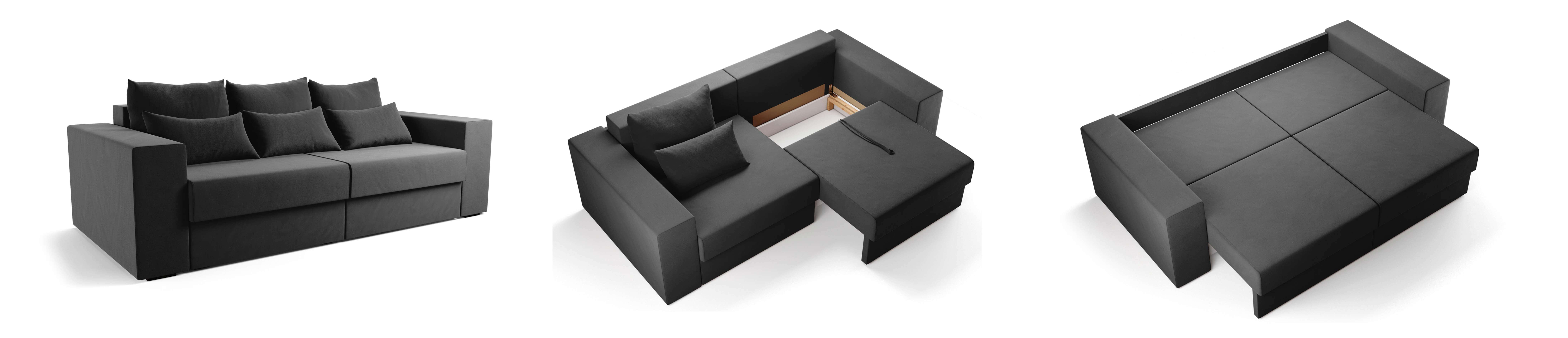The sofa is completed with the Eurobook mechanism for daily sleep, which turns the sofa into a comfortable double bed with a sleeping place of 1730x2020 mm. A huge bed with a spring block and the presence of a niche for bedding are some of the advantages of this model.